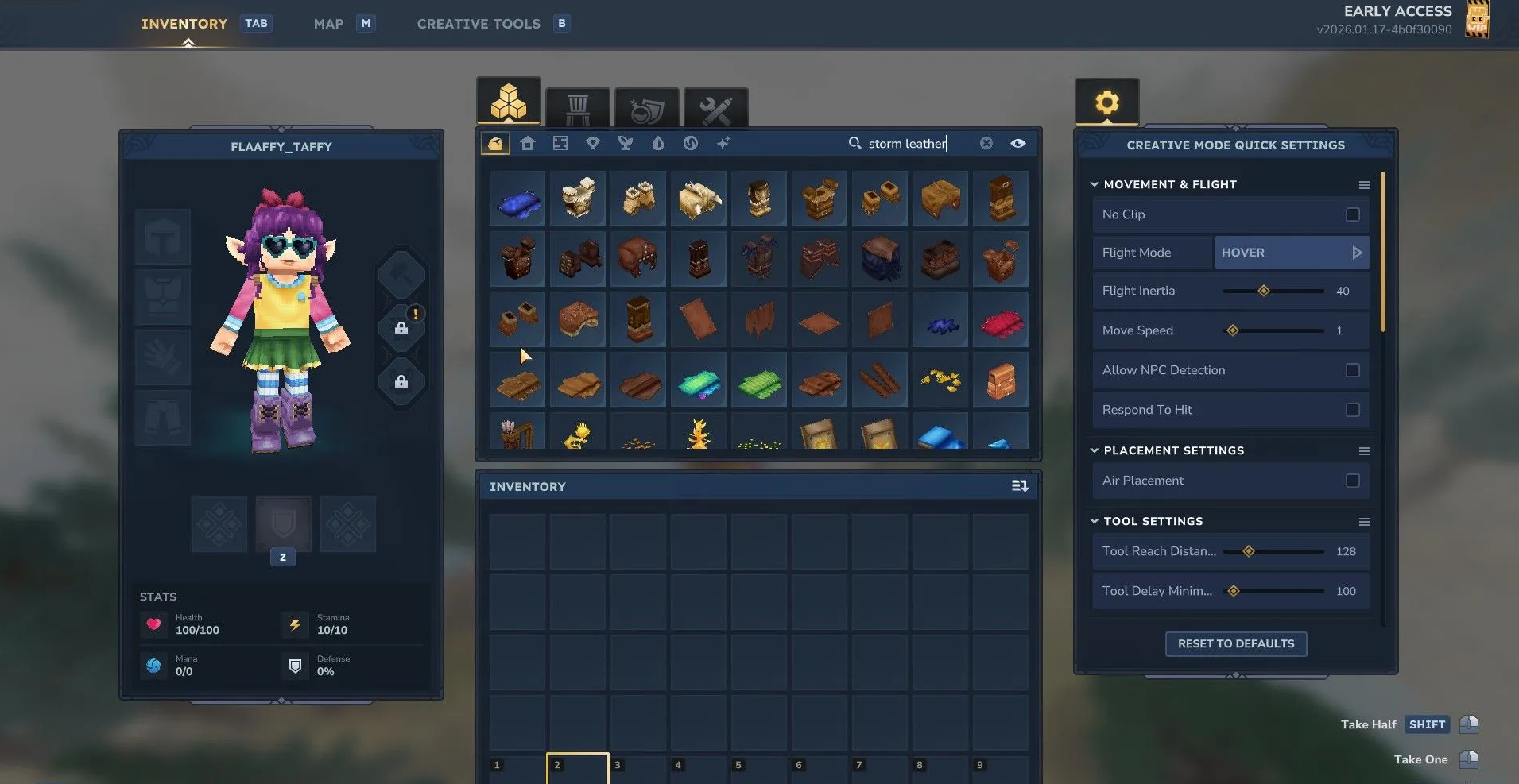 Перетащите иконку Штормовой кожи в свой инвентарь. Вы получите стак из 100 единиц. Снова нажмите «O», чтобы отключить творческий режим и продолжить игру по правилам.