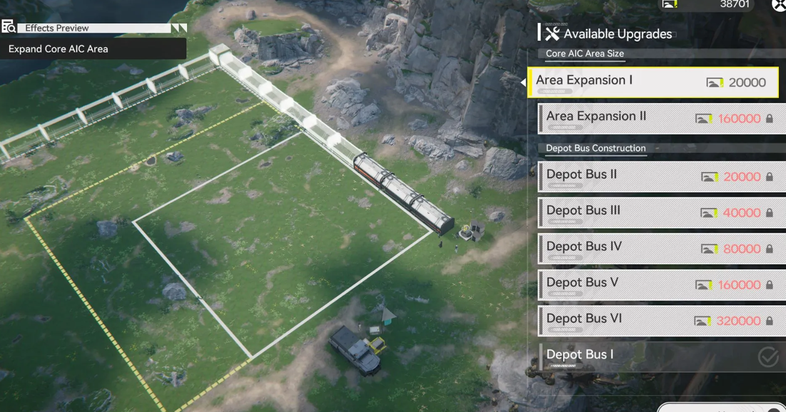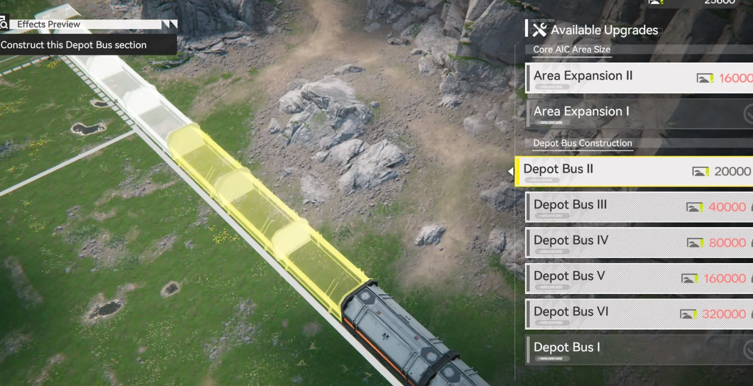 Для доступа к апгрейдам необходимо завершить квест «Смотритель AIC». После разговора с роботом, который появится на юго-востоке базы, откроется меню покупок. Там за Долинные векселя можно приобрести дополнительные участки земли и разблокировать уровни Депо-шины.