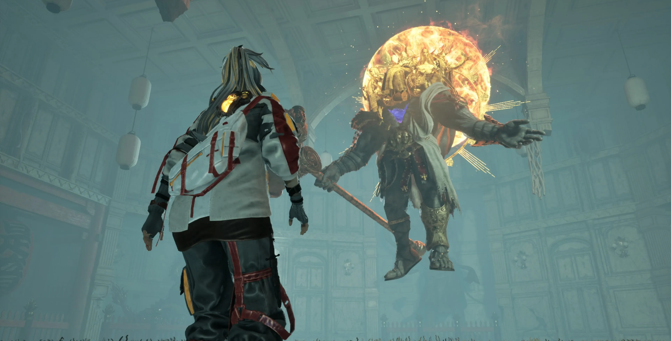 Когда здоровье босса упадет до 60–70%, он сменит бычью маску на золотой убор и отбросит защитное снаряжение. Скорость анимаций резко возрастет, а арсенал пополнится дальнобойными магическими приемами. Теперь уклоняться придется гораздо чаще и точнее.