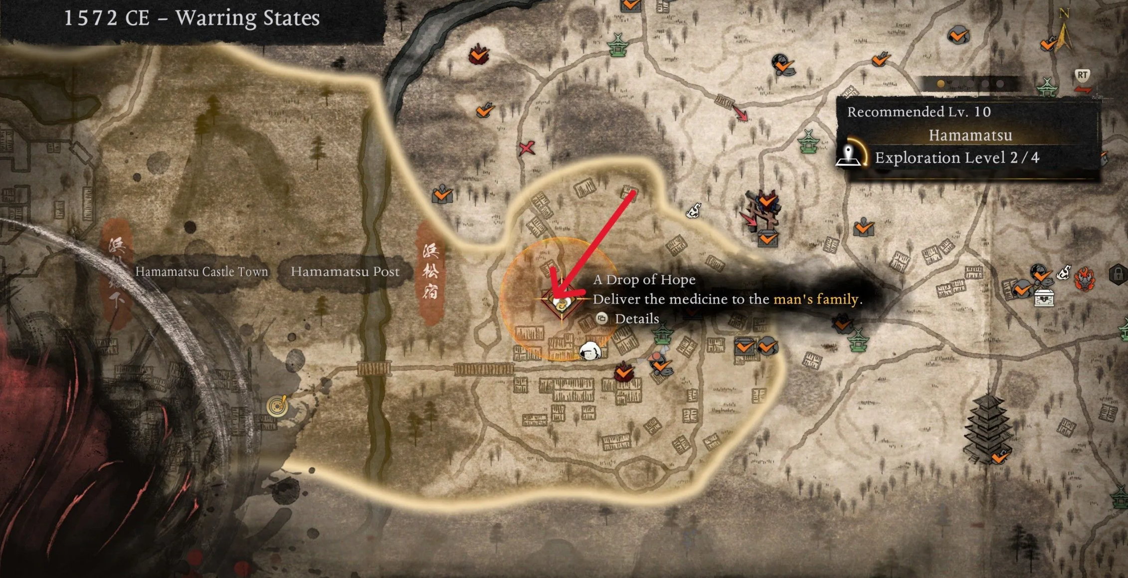 Отыщите золотистую сущность севернее святилища Врата Хамамацу и примите поручение. Уничтожьте бандитов в лагере на юго-западе, заберите квестовый предмет у костра и доставьте его в здание рядом с почтовой станцией, победив охраняющего вход мини-босса.