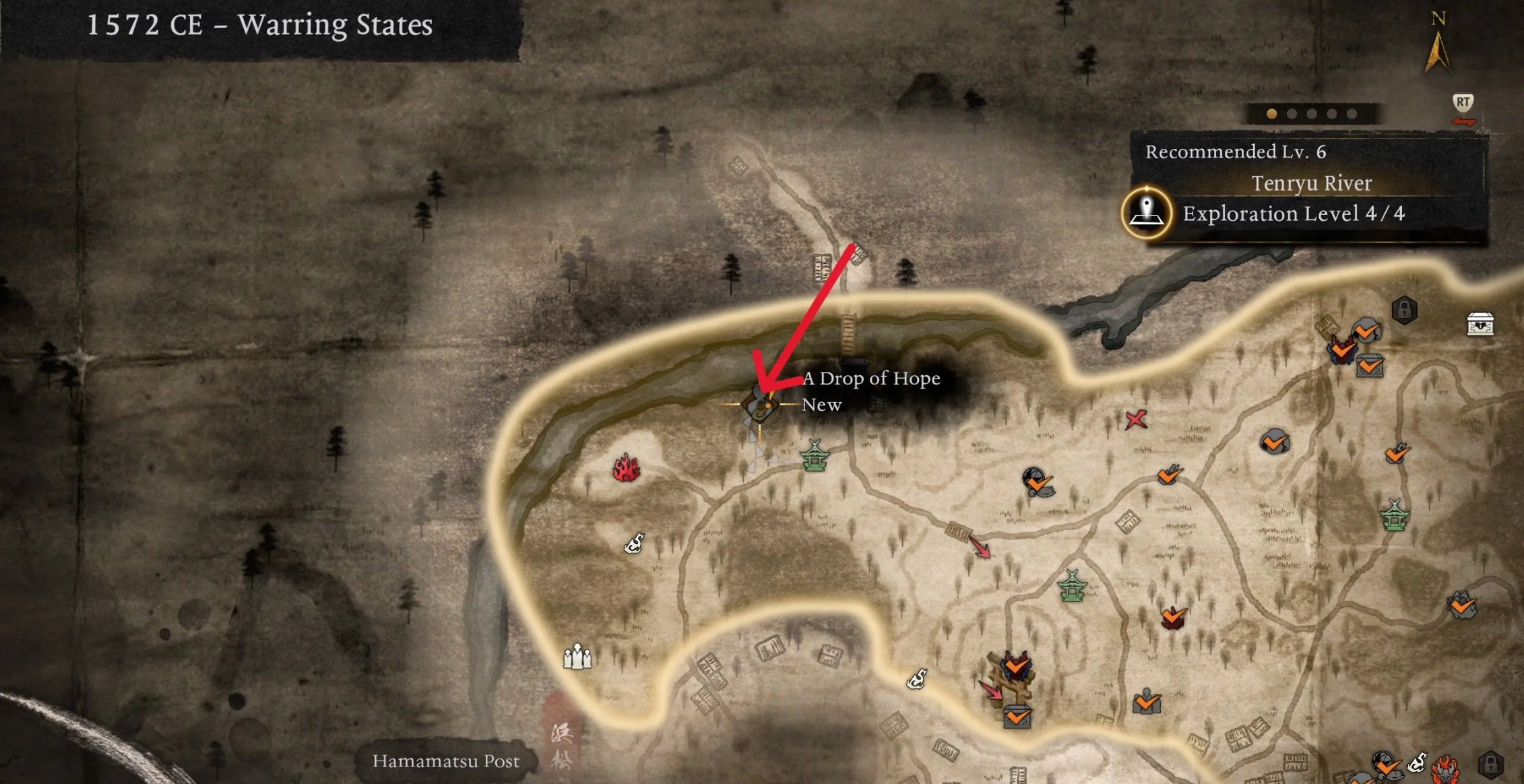 Стартовая точка находится в локации «Река Тэнрю». От святилища «Врата Хамамацу» двигайтесь строго на север вдоль скалистого обрыва, пока не заметите парящего духа с золотым ядром.