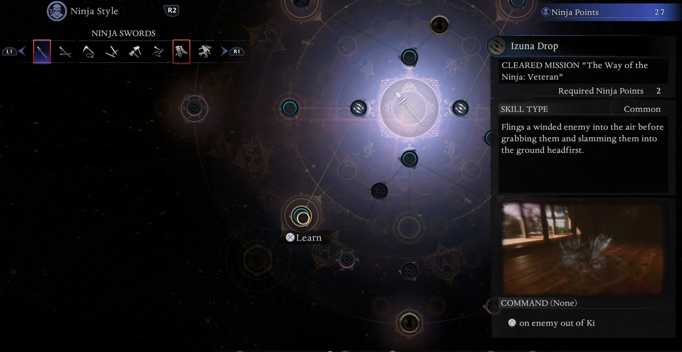 Идзуна Дроп заменяет стандартную анимацию добивания противников, у которых иссякла шкала Ки. Визуально прием выглядит эффектно и радует фанатов Ninja Gaiden, однако с практической точки зрения он не идеален.