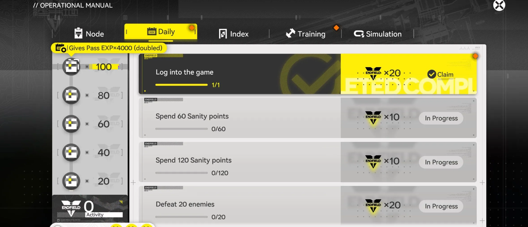 Для развития аккаунта необходимо собирать операционный опыт. Основными источниками служат зачистка Пространств протоколов, активация телепортов на карте, закрытие ежедневных поручений и прохождение обучающих симуляций ИИК.