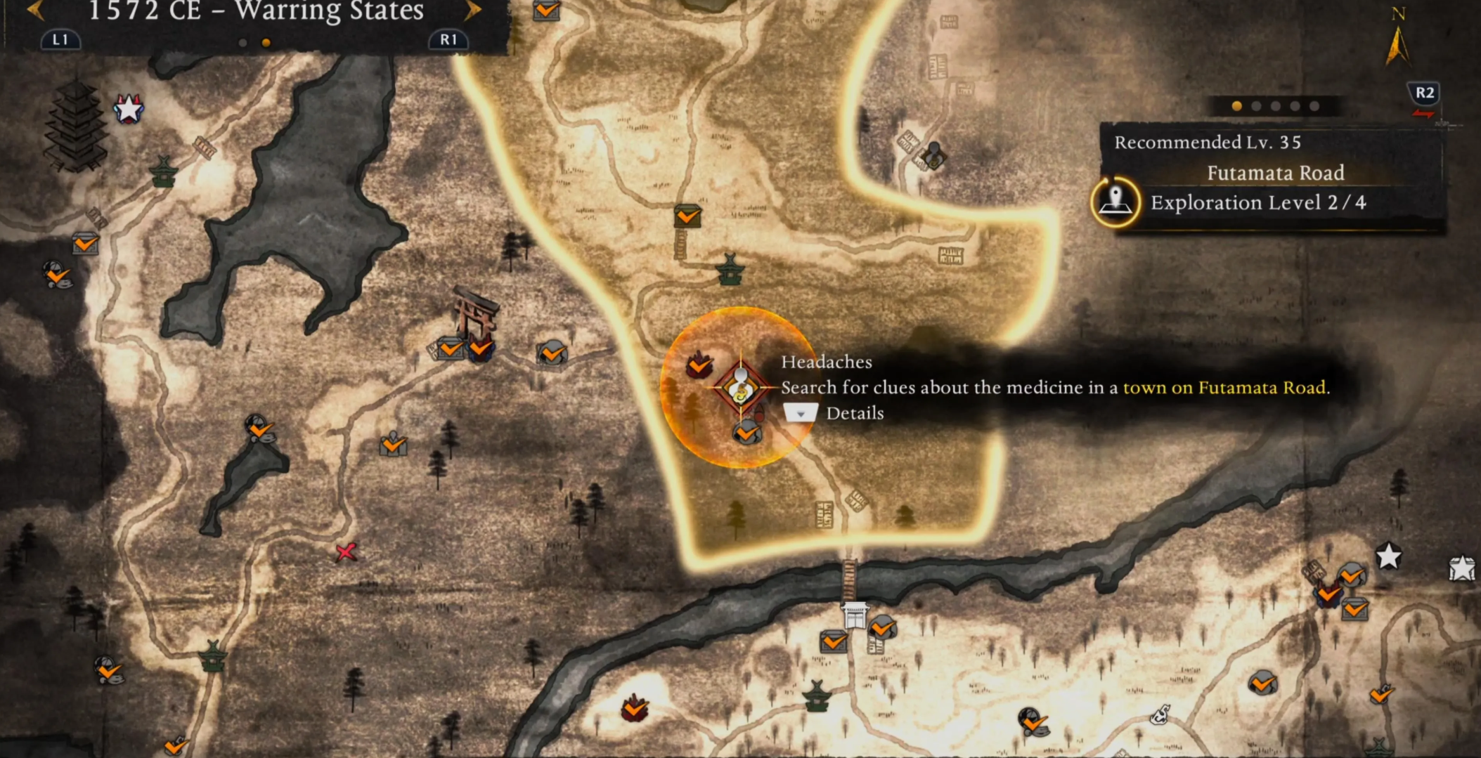 Доступ к миссии открывается после завершения нескольких стартовых мифов. Правитель ожидает вас на вершине твердыни Хамамацу с личной просьбой. Ему требуется средство от мигрени, поиски которого следует начать в поселении у дороги Футамата.