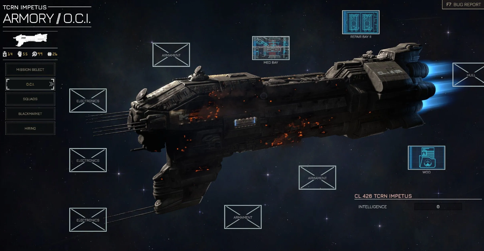 Ваш дом и крепость — корабль TCRN Impetus. Игнорировать его развитие нельзя. Новые модули становятся доступны по мере укрепления доверия фракций и приобретаются за валюту OCI. Апгрейды открывают критически важные функции: