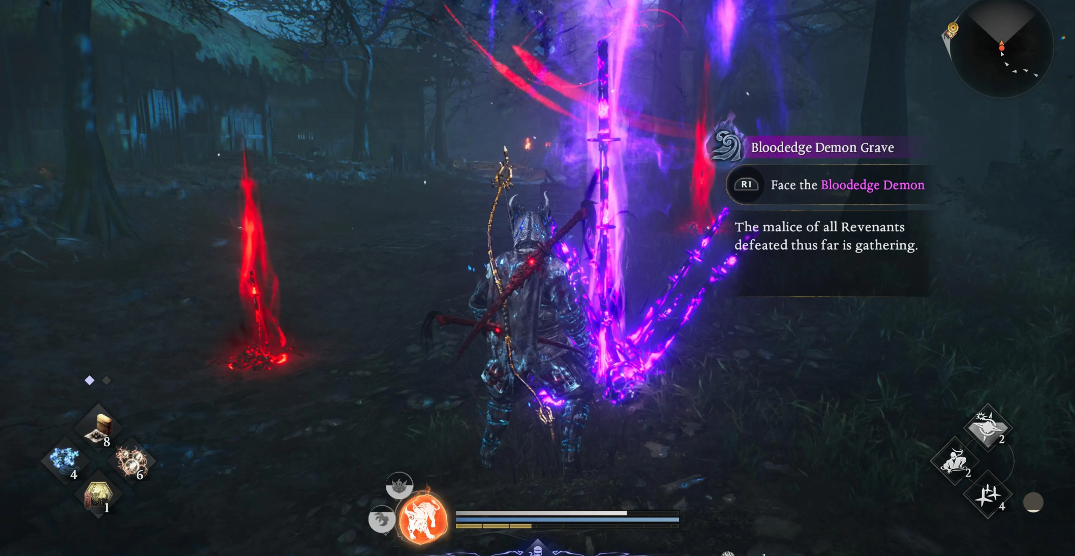 Чтобы вызвать босса на дуэль, необходимо уничтожать фантомов из могил одержимых и следовать за появляющимися красными сферами. Этот след приведет к особому фиолетовому захоронению. В бою с демоном ключевую роль играет защита: блокируйте смертоносные серии ударов в стиле самурая, держите среднюю дистанцию и используйте расходники ниндзюцу для нанесения урона издалека.