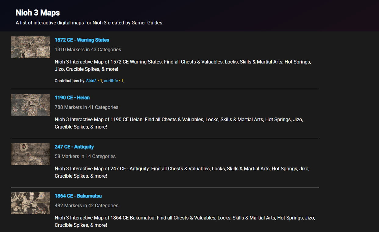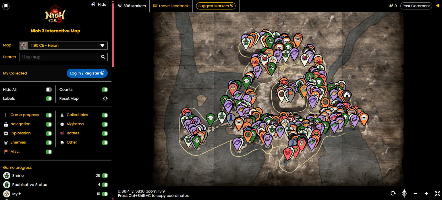 Большинство сайтов оснащены системой фильтров, позволяющей оставить на экране только нужные категории меток. Также полезной функцией является трекер прогресса, где можно отмечать уже посещенные места. Ниже приведен список лучших ресурсов для Nioh 3.