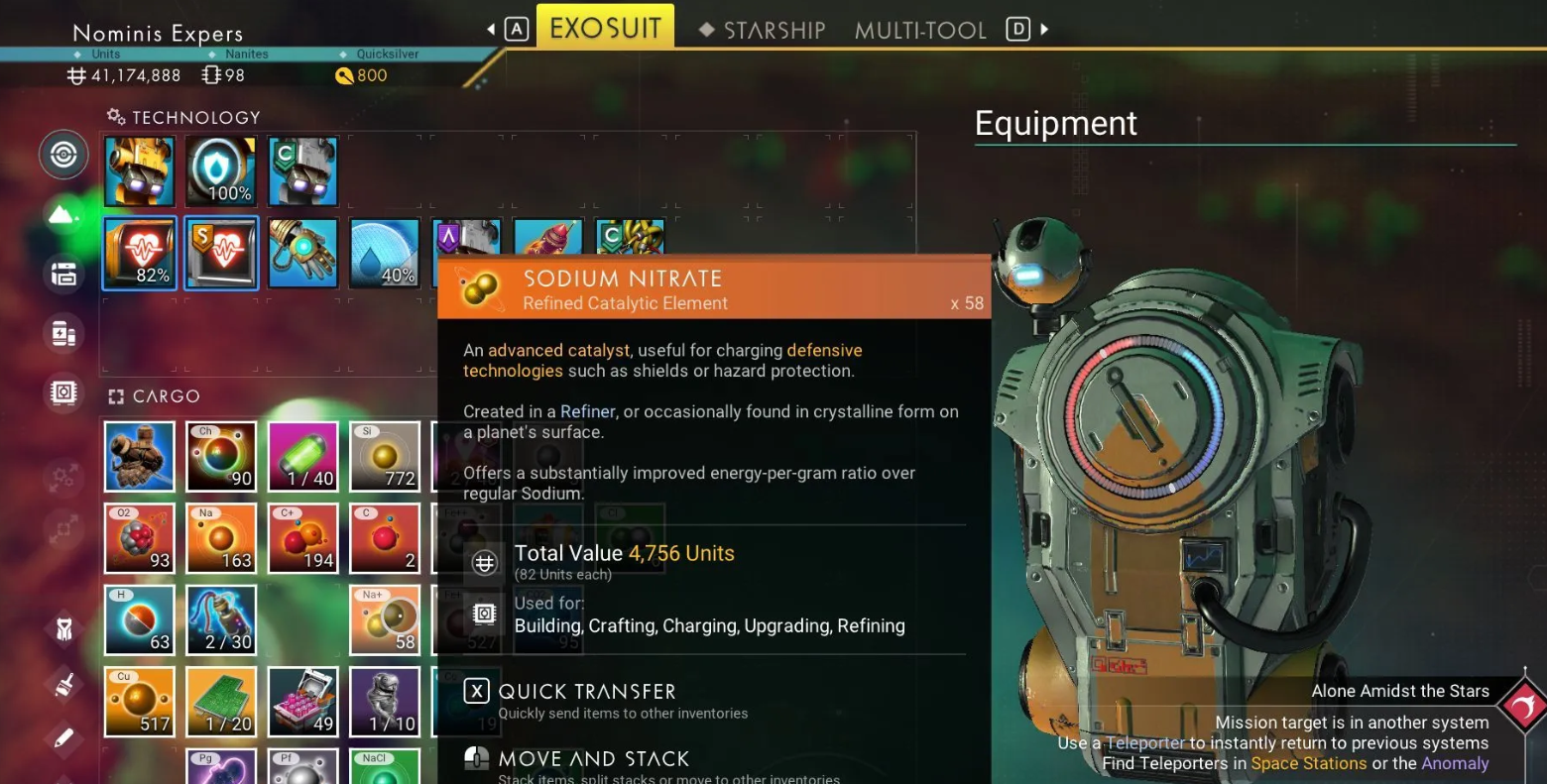 Самый быстрый способ пополнить запасы — просканировать поверхность любой планеты и найти желтые светящиеся кристаллы с маркировкой Na+. Для их добычи потребуется улучшенный горный лазер. Если инструмента нет, собирайте обычный натрий и перерабатывайте его в рафинере.