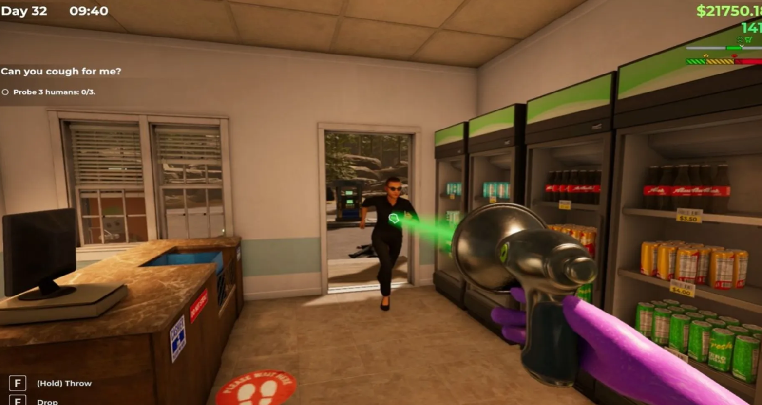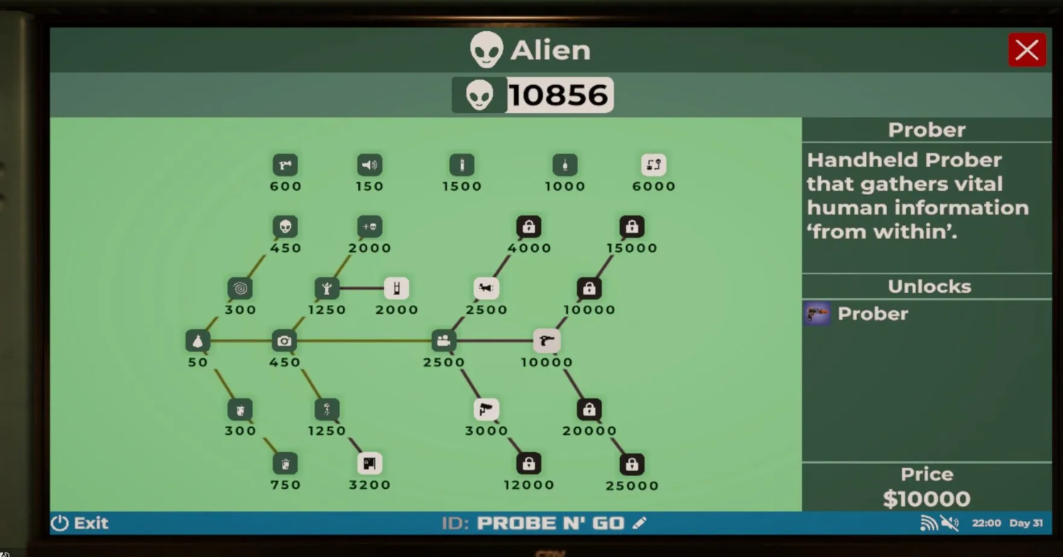 Зарабатывая очки пришельца на обслуживании клиентов, вы сможете продвигаться по ветке технологий. Первым доступным прибором станет камера, а сразу после нее открывается доступ к Зонду. Стоимость чертежа составляет 10 000 очков.