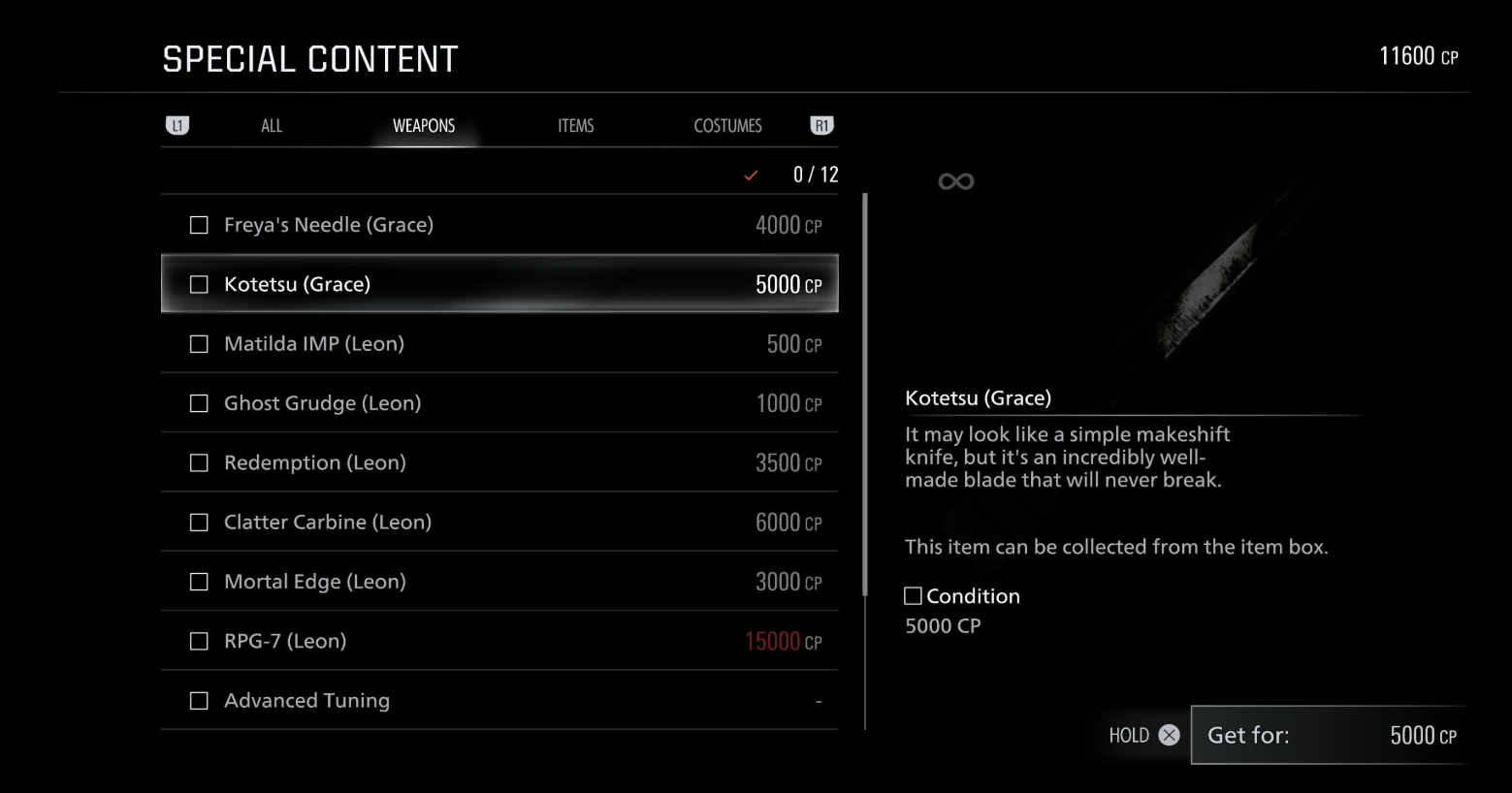 Котэцу (5000 CP) — неразрушимый клинок, позволяющий перерабатывать обычные ножи в ресурсы вместо их использования для самообороны