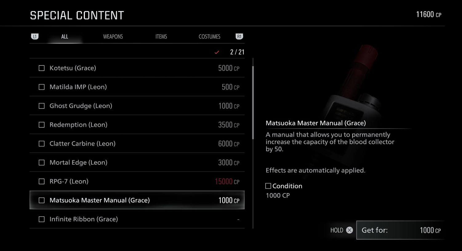 Мастер-руководство Мацуоки (1000 CP) — увеличивает емкость сборщика крови на 50 единиц, позволяя запасать больше материалов для создания усиливающих инъекторов