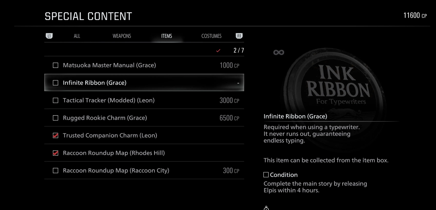 В игре предусмотрено пять особых наград, которые приобретаются за очки выполнения (CP) или выдаются за спидран. Они открывают доступ к бесконечным сохранениям, нелимитированному боезапасу и вечному холодному оружию, значительно упрощая повторные забеги на высокой сложности.