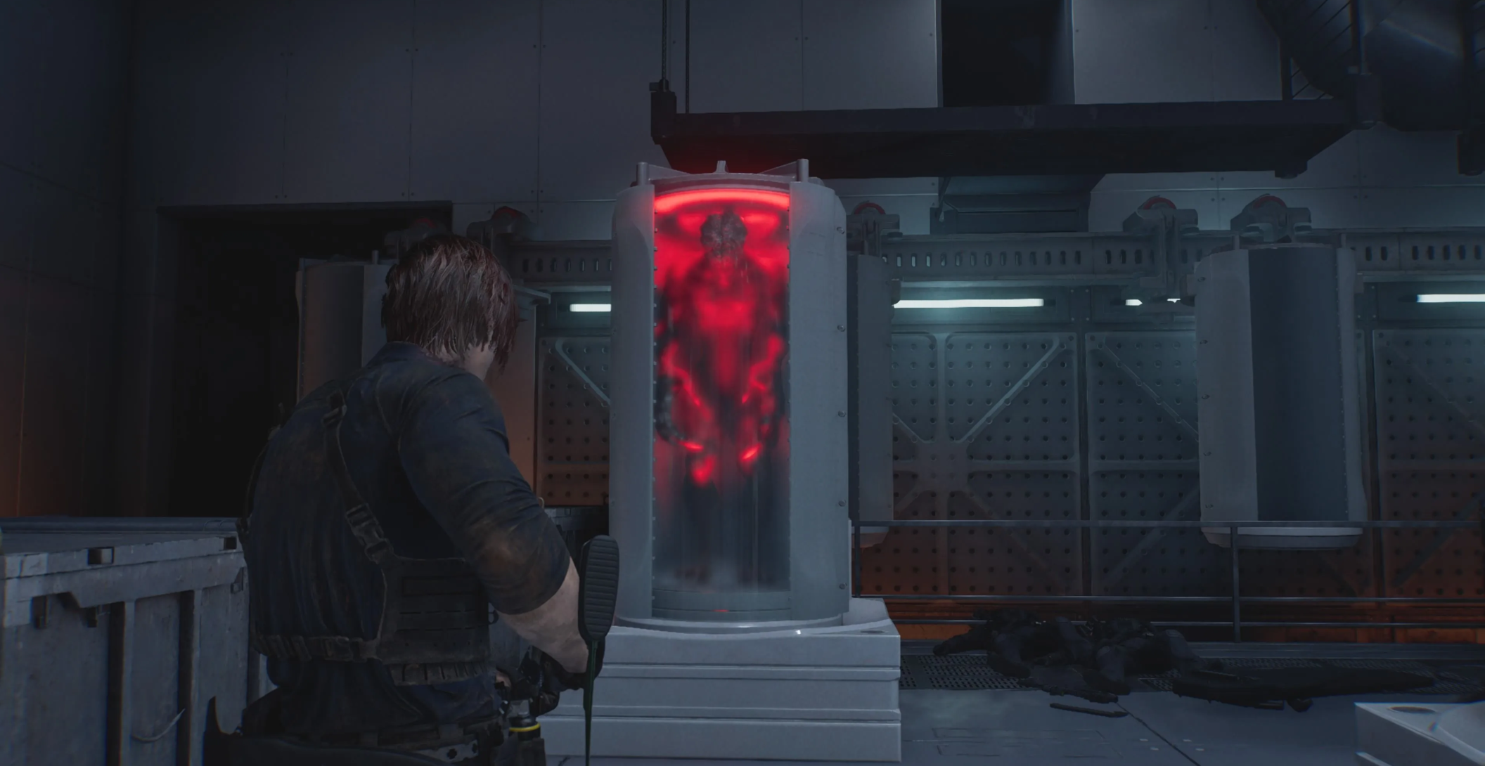 В кладовой во время первой части главы «КОВЧЕГ», выстрелив в контейнер с биоматериалом