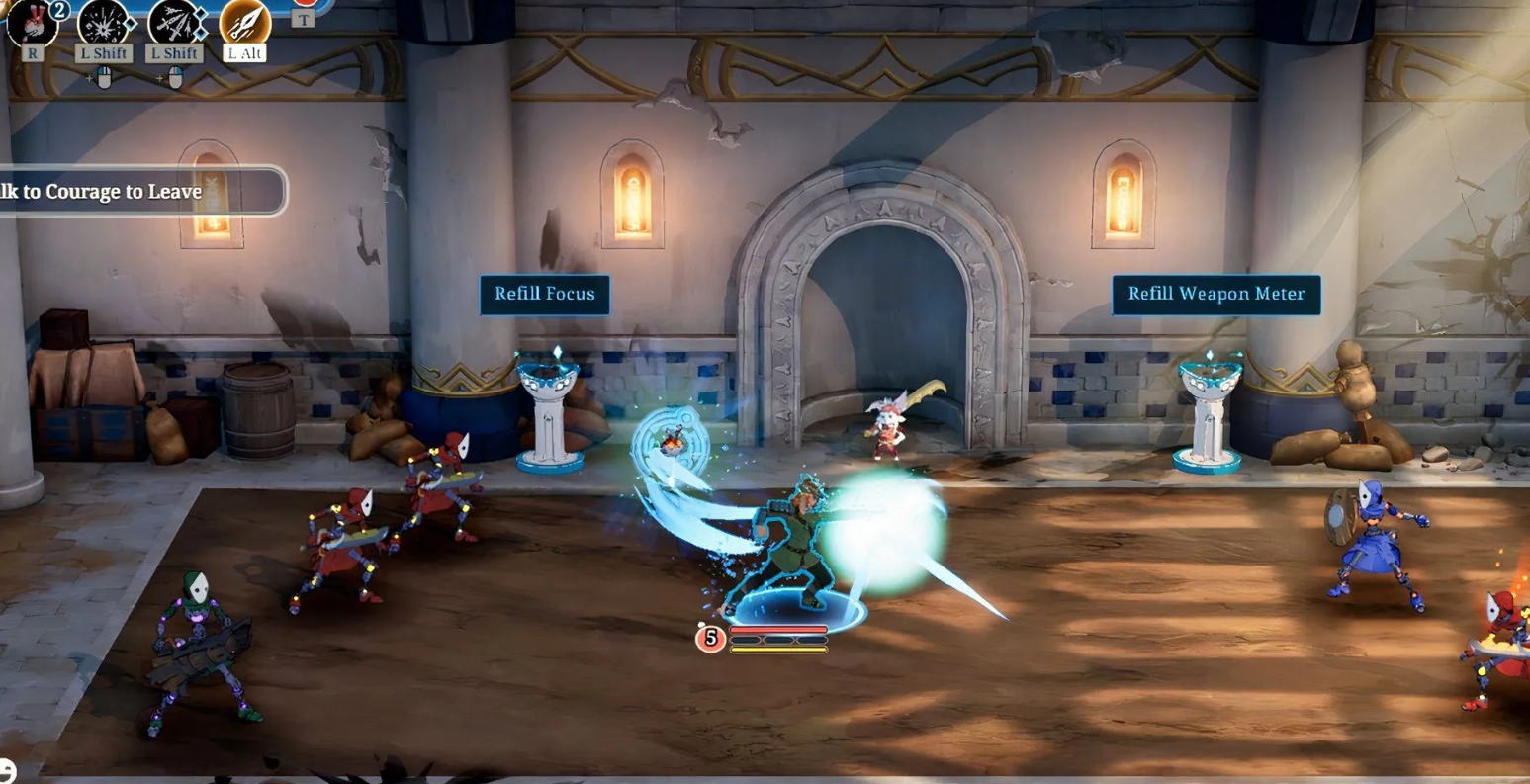 Отработать ротации и проверить неизвестные навыки можно без риска для жизни. Для этого посетите Зал тренировок в восточном крыле города. Там вас встретит кролик-инструктор Караж, который поможет освоить управление. Подсказки по клавишам также доступны в меню умений.