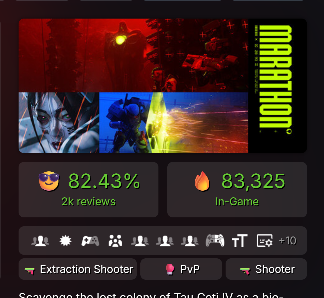 PvPvE-шутер Marathon показал успешный старт на площадке Valve — пиковый онлайн новинки превысил 86 тысяч человек. Проект студии Bungie, известной по сериям Halo и Destiny, в первые дни после релиза привлек одновременно 86 712 пользователей.
