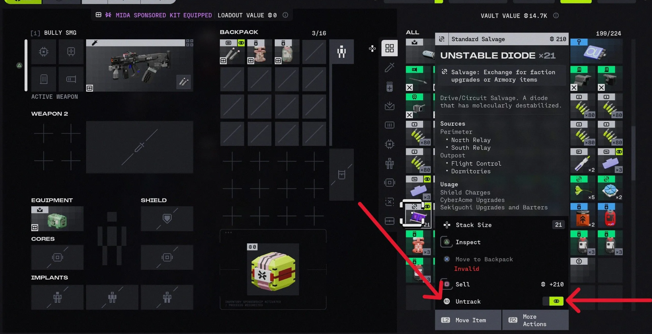 Функция трекинга помогает быстро собирать компоненты для крафта, не отвлекаясь на лишний мусор. Процедура добавления цели в список предельно проста и выполняется через меню снаряжения.