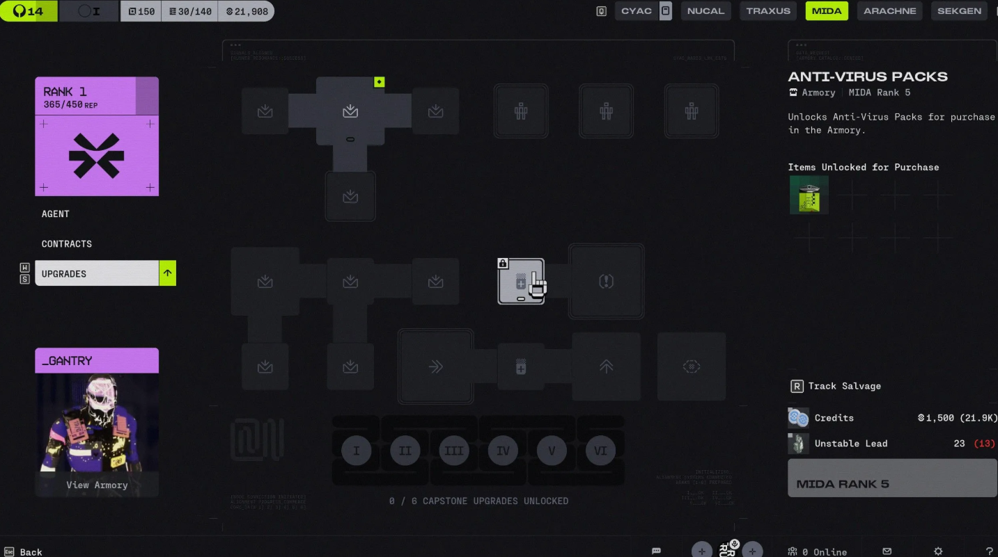 Ключ к успеху кроется в наличии антивирусного набора, который можно разблокировать через фракцию MIDA. Вам потребуется достичь пятого ранга репутации, заплатить 1500 кредитов и отдать 23 единицы нестабильного свинца во вкладке улучшений. Если прокачанные аккаунты с высоким уровнем репутации отсутствуют, придется искать предмет в ящиках на локациях, полагаясь на удачу.