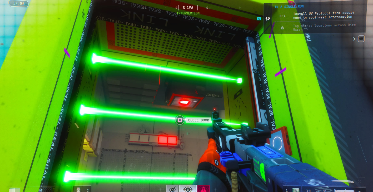 Стартовым условием служит внедрение вируса на судно «UESC» и визит в «Гантри». Далее отправляйтесь исследовать западный сектор карты. Если ваши аккаунты не изобилуют топовым снаряжением, берите бесплатную экипировку во избежание обидных потерь. Двигайтесь к юго-западному сегменту «Перекрестка», где расположено синее здание с лазерной сеткой. Для деактивации преград расстреляйте пять блоков питания.