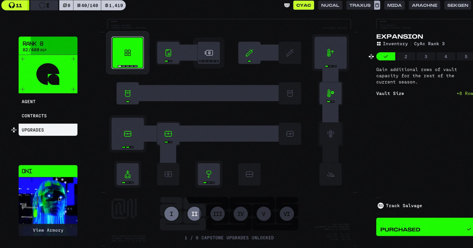На старте рекомендуем сфокусироваться на ветке CyberAcme. Данная фракция предлагает самые фундаментальные апгрейды: