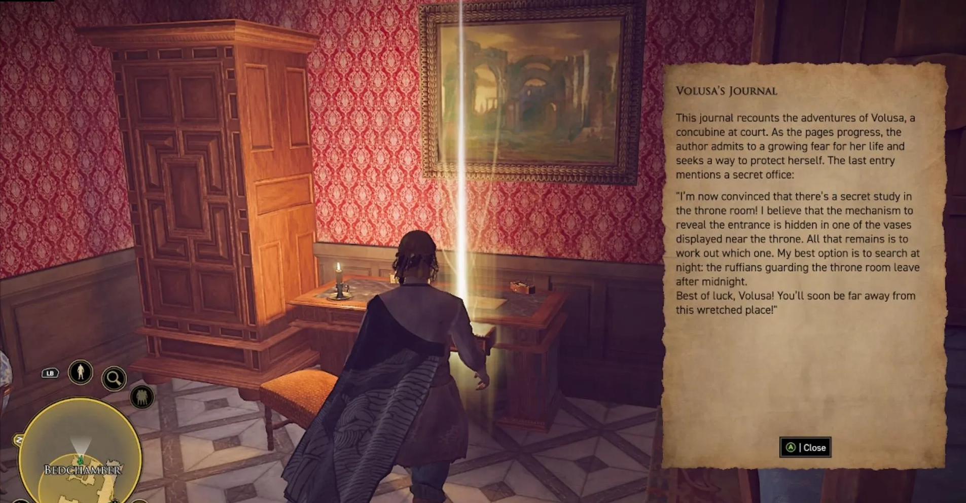 На столе лежит дневник. Записи укажут на существование скрытой комнаты, куда следует проникать исключительно ночью. Дождитесь темного времени суток и возвращайтесь к трону. Примените навык следопыта для осмотра стоящих рядом ваз: