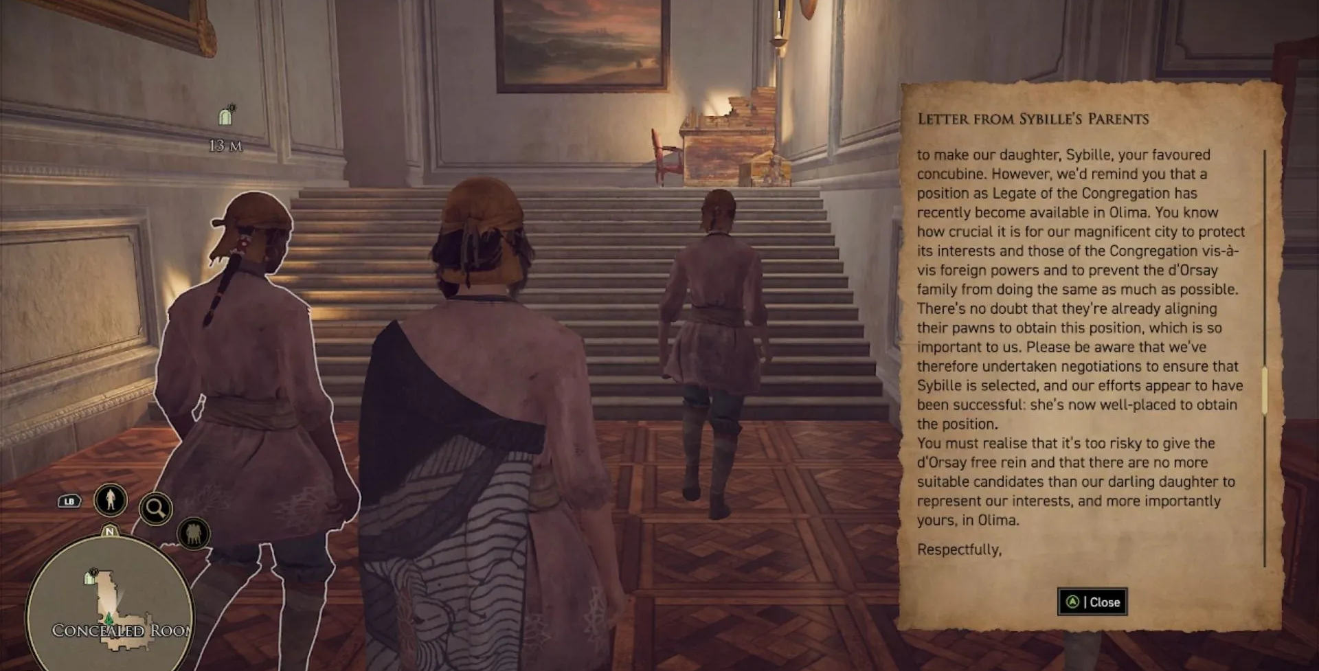 Поговорите с принцем и обыщите покои Волусы. Найдите тайник за вазой в тронном зале после полуночи. Сделайте выбор между Веспами и семьей д'Орсе, а затем поддержите компаньонку в разговоре с родителями.