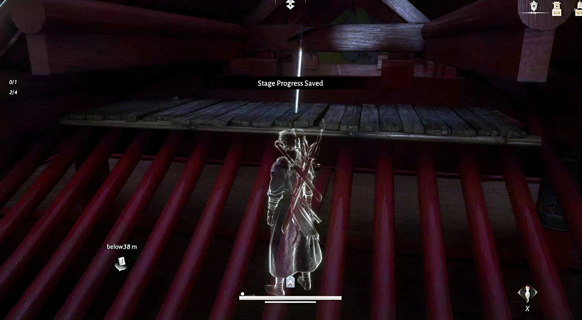 Находясь в помещении, перемещайтесь исключительно по подвесным полкам и верхним деревянным балкам кладовой, минуя стражу на нижнем ярусе. Оказавшись ровно над головой лидера секты, нажмите кнопку взаимодействия и безошибочно выполните цепочку быстрых нажатий, чтобы навсегда пополнить свой арсенал техникой «Бамбуковый срез — Прах».