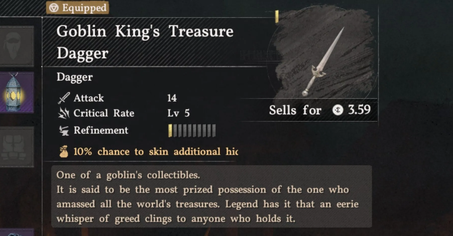 Вспомогательные клинки редко применяются ради прямых столкновений. Рассматриваемый экземпляр обладает врожденным талантом, который дает десятипроцентный шанс получить дополнительную шкуру при разделке убитых зверей.
