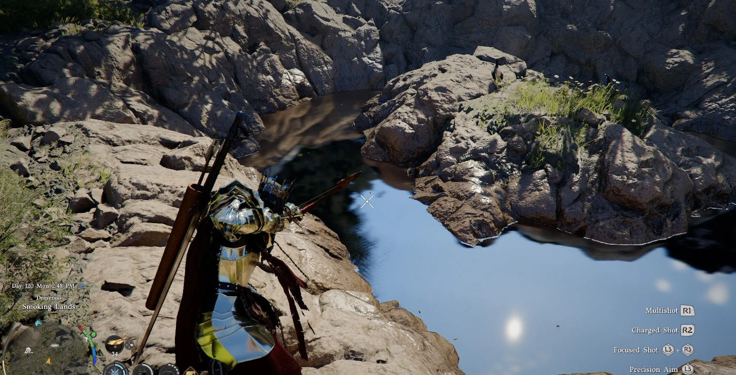 Отправляйтесь в Пылающие земли севернее Деменисса и отыщите серебристый водоем. Используйте лук с навыком Пронзающий ветер и стихией Мороза первого уровня, чтобы заморозить лужу. После выстрела собирайте образовавшиеся твердые куски материала.