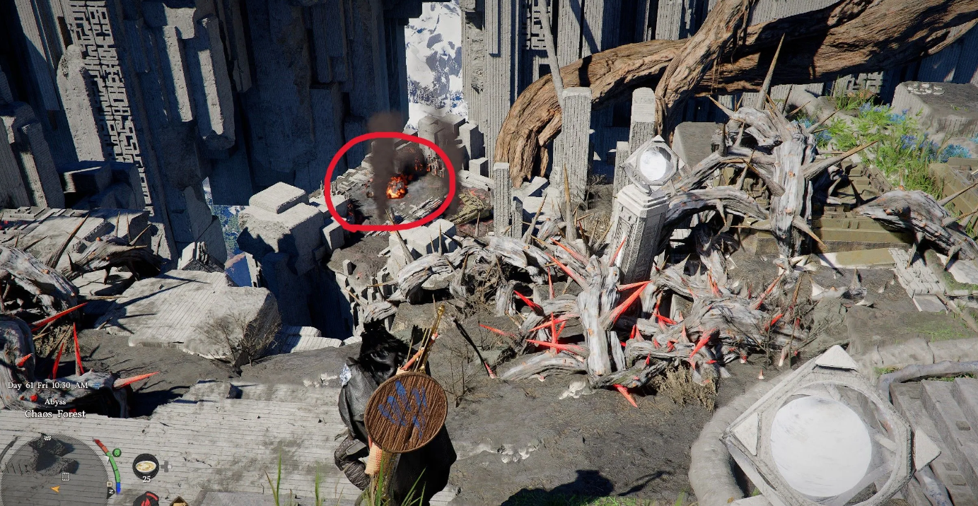 Сожгите преграду справа за прудом навыком «Элемент: Тлеющий удар»