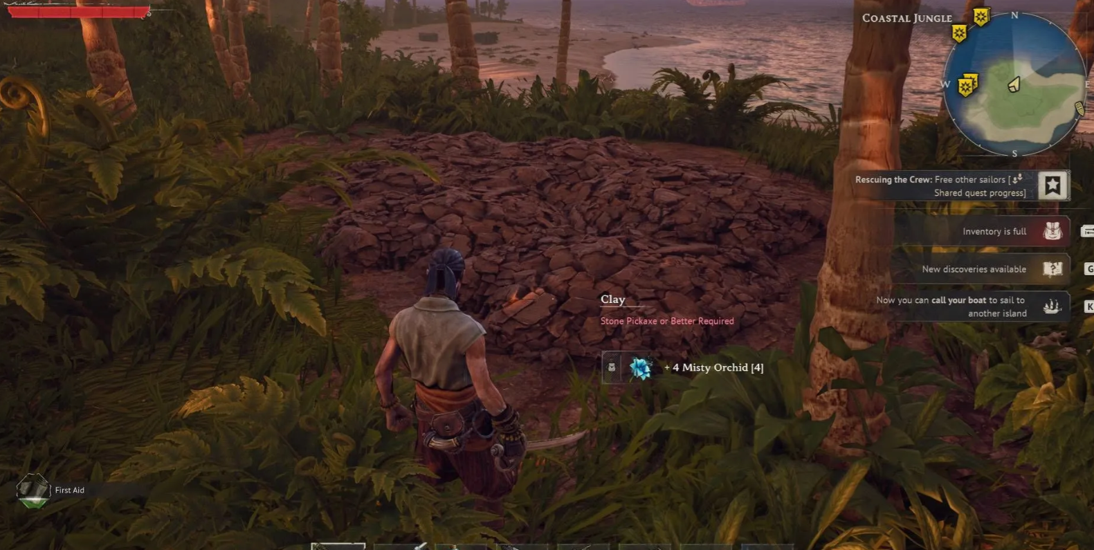 Ищите темные земляные кучи на территории стартового тропического биома. Для сбора породы потребуется вооружиться каменной киркой. Базовое снаряжение крафтится за рабочим столом при наличии трех булыжников и такого же количества бревен.