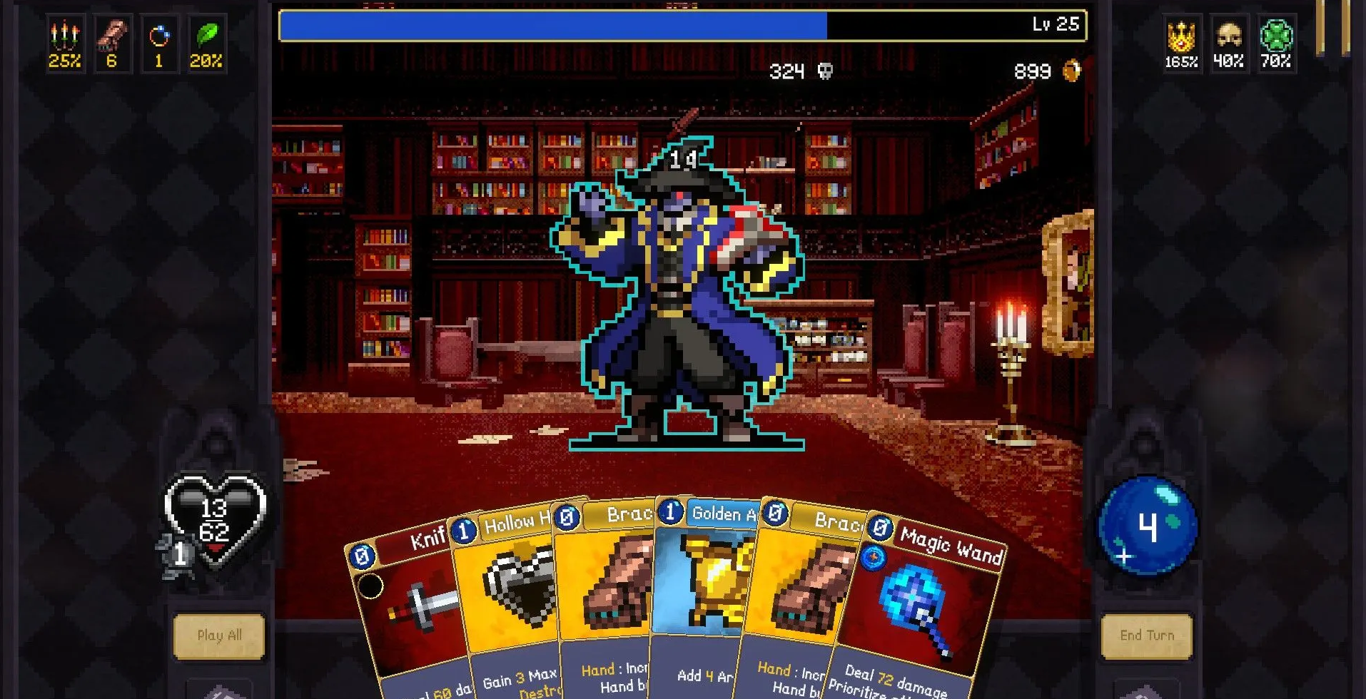 Сразу после гибели последнего духа на арену выходит сам Несуфритто. Одолеть его без прокачанной Силы или понимания карточных механик будет крайне трудно. Враг постоянно меняет тактику, поочередно используя два приема.
