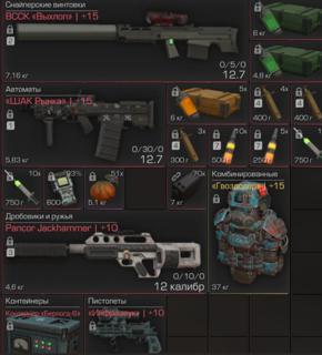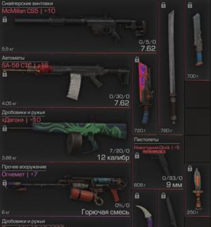 FAMAS, Аш-12 в облике шак рынка+15, jackhammer +15, Рш в облике инфразвук, Карбач+15, АА-12, derya, Glock +15,Морозная бритва, Синобикатана, прижигатель,Выхлоп+15 и много всего все не помню.