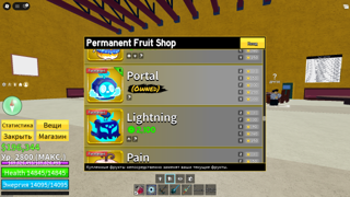 Были съедены все фрукты вкачаны:Драгон(500мастери), китсуне, контроль,йети, тигр,газ,тень, тесто в2,гравити,боль, рамбл(есть красный скин)портал,творение,Будда в2 только форма,магма в2,свет в2, алмаз.